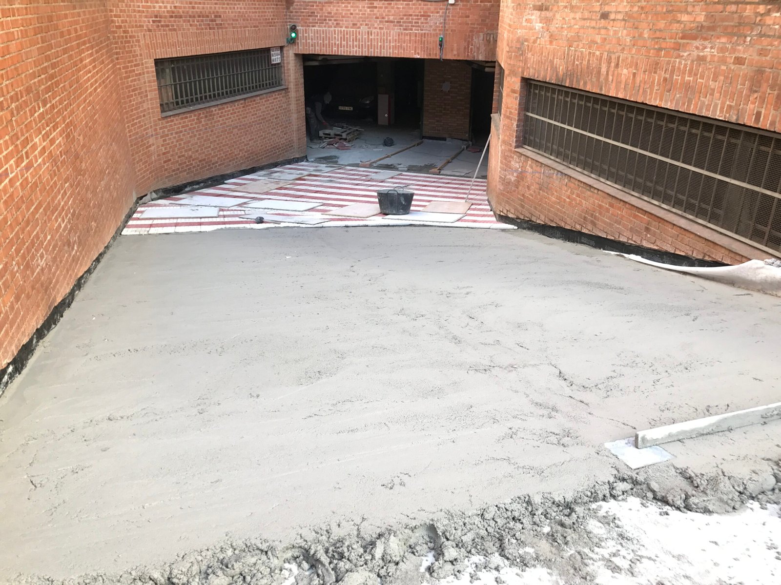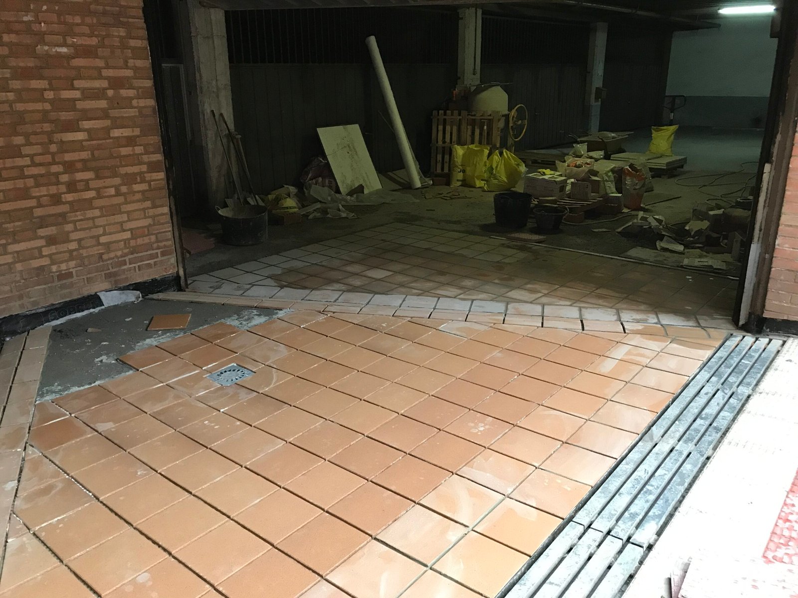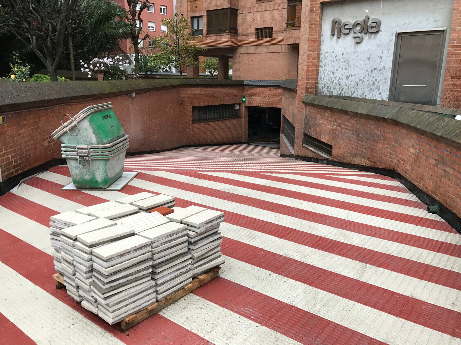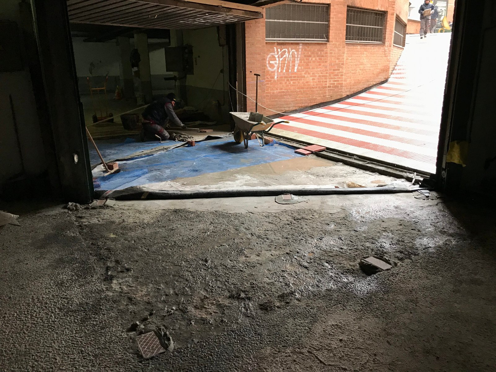 Impermeabilización de rampa de garaje, jardineras y acera, para evitar la entrada de agua al interior de los garajes, así como reparación de las armaduras de la estructura de hormigón de los forjados, deteriorada por la entrada de agua. Pasivado de armaduras, y recomposición de volumen con morteros sin retracción en vigas y viguetas de la estructura de los forjados.