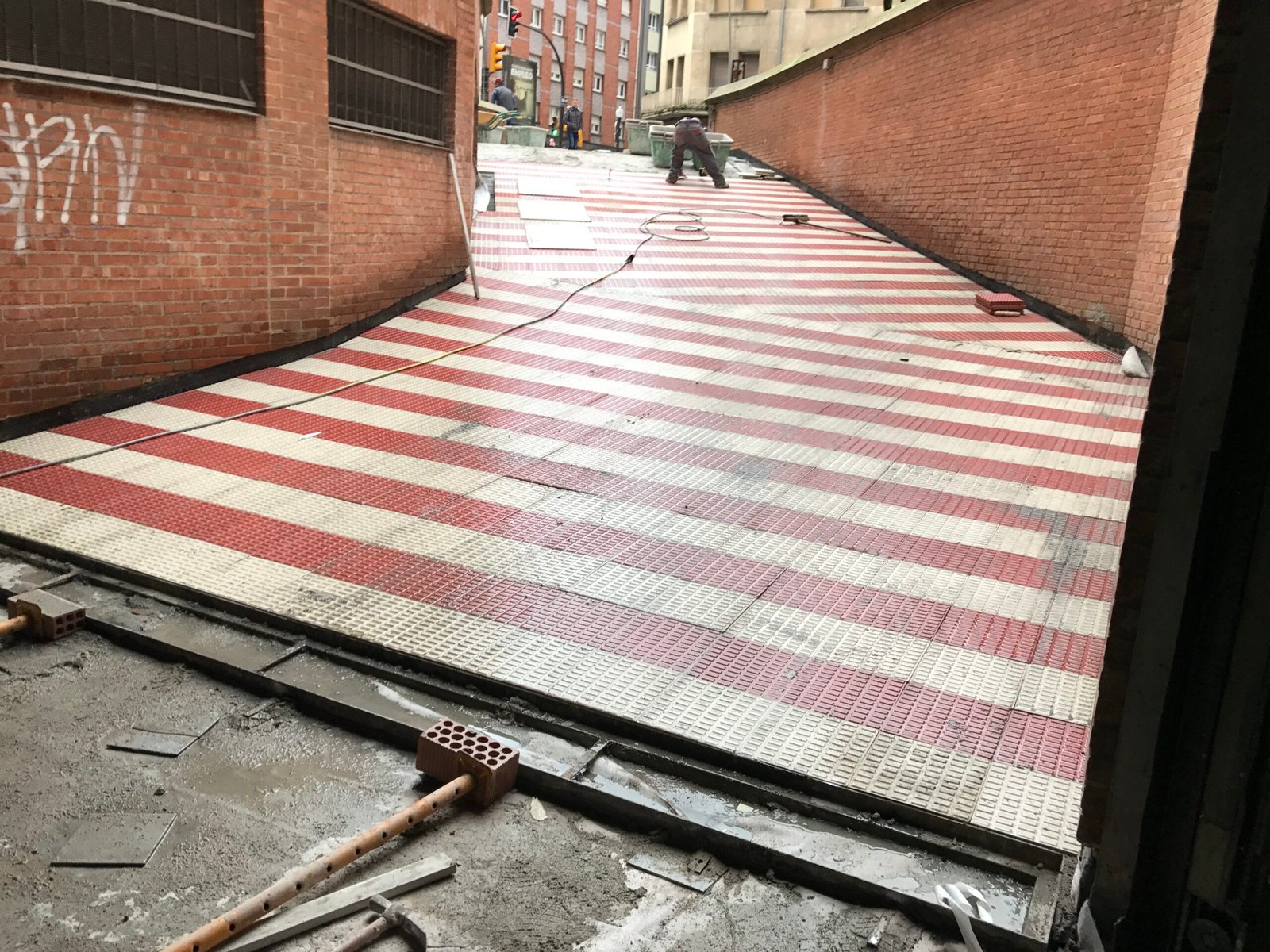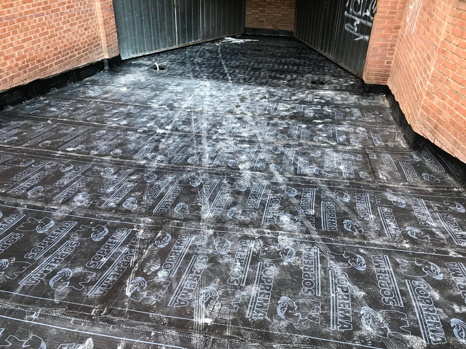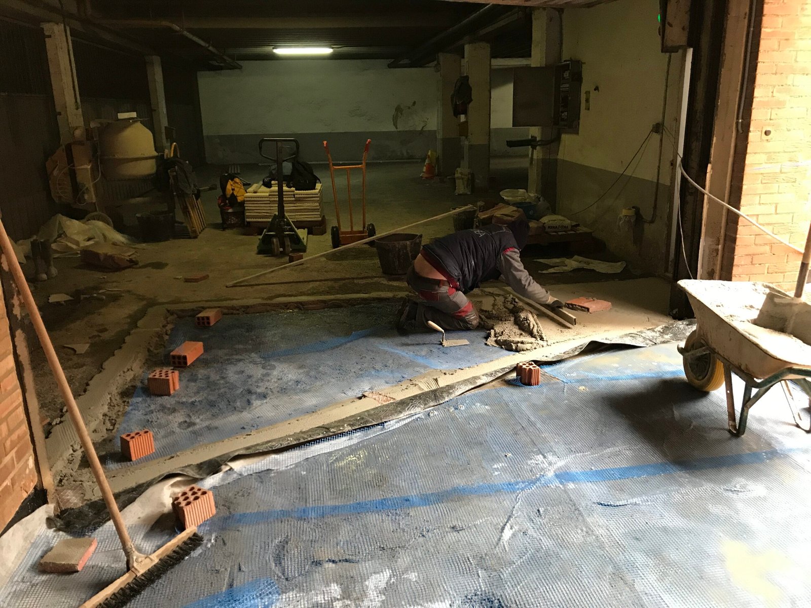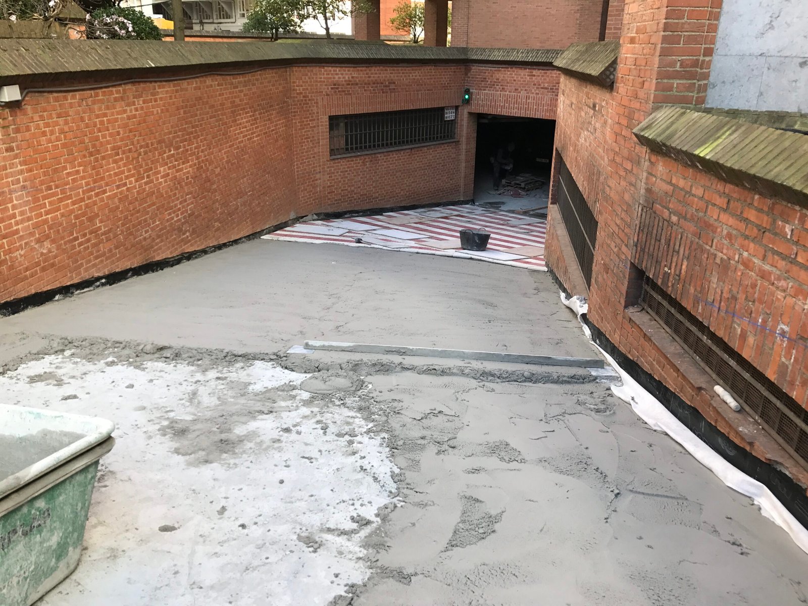 Impermeabilización de rampa de garaje, jardineras y acera, para evitar la entrada de agua al interior de los garajes, así como reparación de las armaduras de la estructura de hormigón de los forjados, deteriorada por la entrada de agua. Pasivado de armaduras, y recomposición de volumen con morteros sin retracción en vigas y viguetas de la estructura de los forjados.